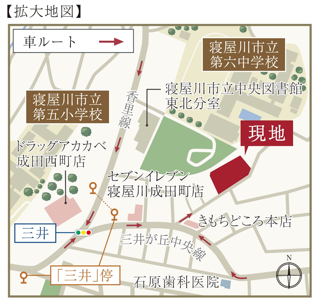 | 交通 | 京阪本線「香里園」駅まで自転車6分 京阪バス「三井」停まで徒歩4分、京阪バス「京阪香里園」停までバス乗車9分、京阪本線「香里園」駅まで徒歩2分 |